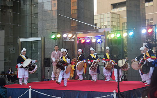 オープニングでは日韓の茶道のパフォーマンスから始まり、韓国伝統風音楽演奏のサムルノリのチーム(民団大田支部チャンゴチーム)が会場の舞台で演奏しました。