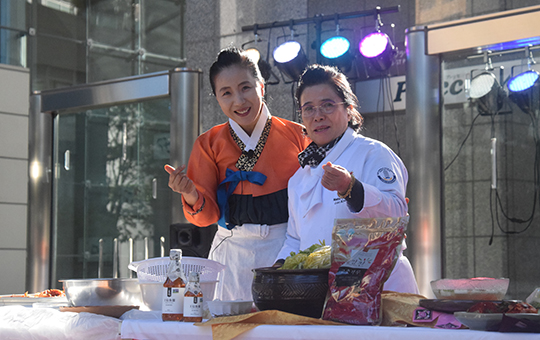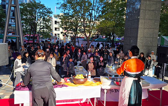 舞台前ではキムチ名人の称号をもつ、当協会の理事長・趙善玉によるキムジャンキムチ体験(23・24日両日)を行いました。キムジャンは、ユネスコ無形文化遺産に登録されている韓国の伝統文化です。