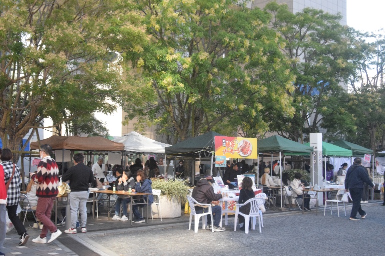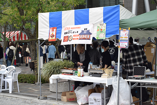 会場には約20のテント・5台のキッチンカーが配置され、日韓の食品企業による展示販売や、日韓の飲食販売が行われ、お昼どきには行列ができるテントもありました。キッチンカーではカレーやチュロス、ステーキ串など韓国料理以外の飲食物も販売され、多彩な料理が揃いました。