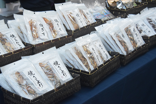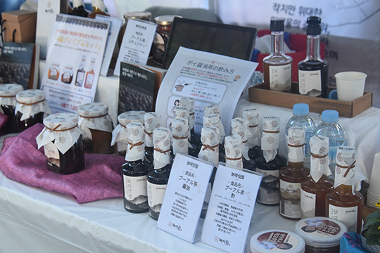 企業テントでは、日本からは九州の八女茶やうれしの茶、愛媛の魚介のだし塩や干物、韓国からは魚醤や醤油、味噌、酢、唐辛子粉、薬草インスタントコーヒーなど、優良な中小企業の商品が並べられました。