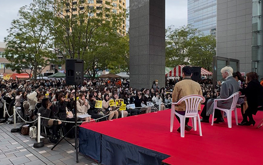 1日目に行われた今回の目玉となる舞台行事。客席の左右後ろ側は来場者で埋め尽くされ、通路の後ろ側にも並ぶほどの大盛況でしたが、来場者・ファンの皆様がマナーよく指示に従ってくださり、無事に実施されました。チャン・ハヌムさんには「目黒元気まつり」広報大使を任命し、任命書を授与いたしました。