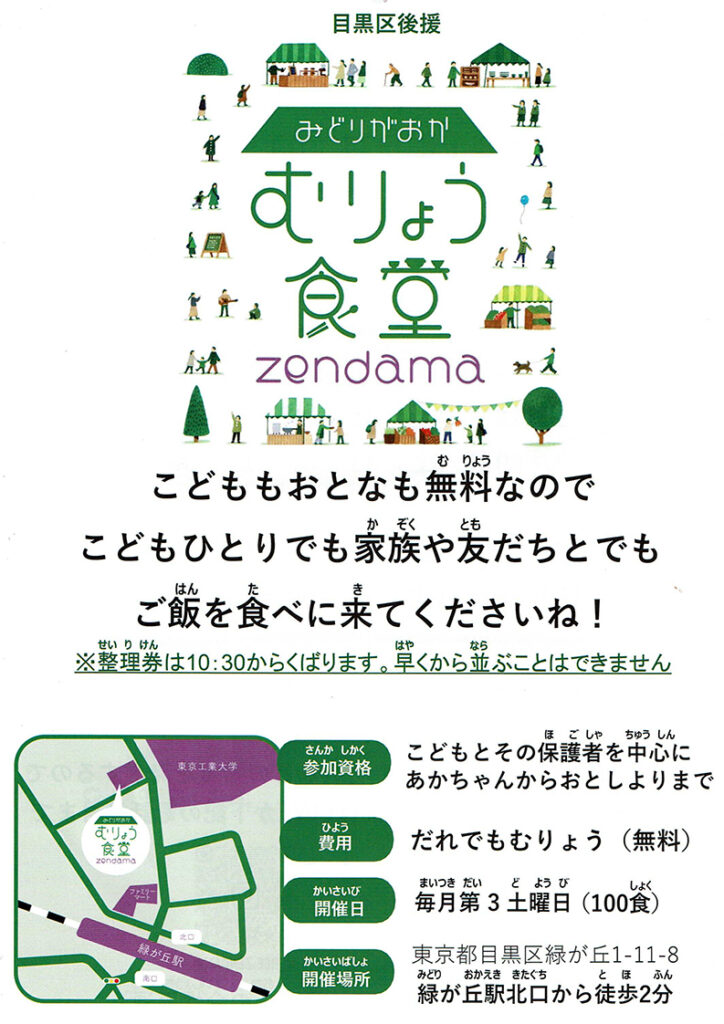 毎月第3土曜日に、目黒区緑が丘にて「みどりがおか むりょう食堂」を運営しています。誰でも無料でお食事ができ、あかちゃんからお年寄り、地域の子どもたちや保護者たちが多く集まります。毎回、多数のボランティアスタッフにより、運営されています。