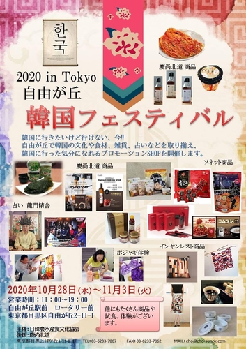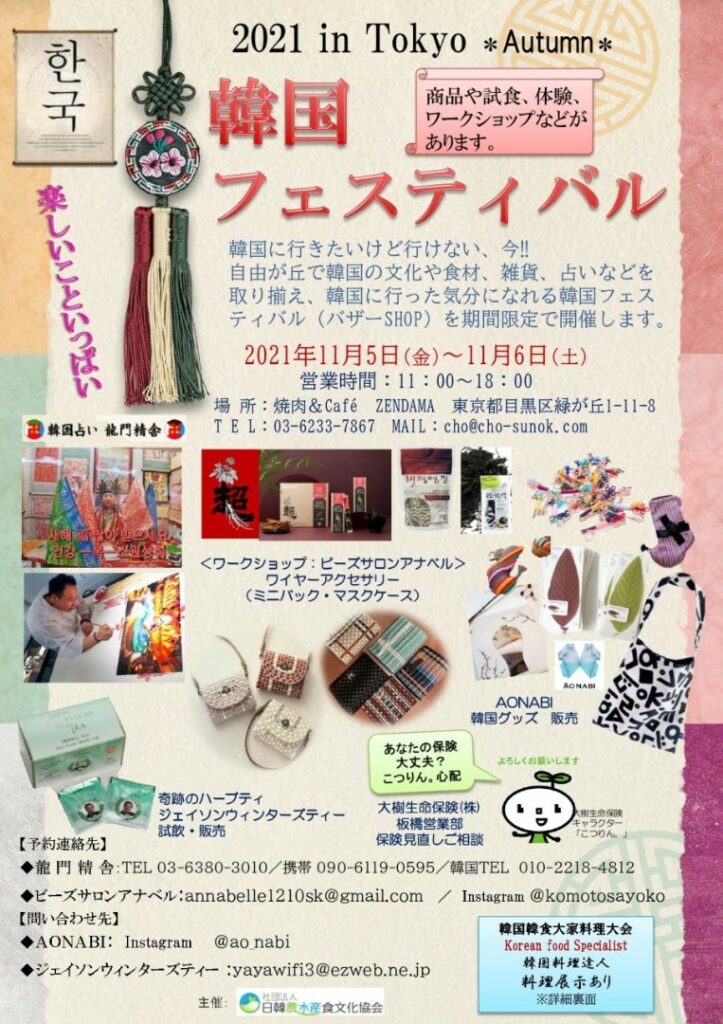 2020年秋、2021年の春には自由が丘駅前ロータリーを中心に、2022年は自由が丘のお隣、緑が丘にて「韓国フェスティバル」を企画、運営しました。